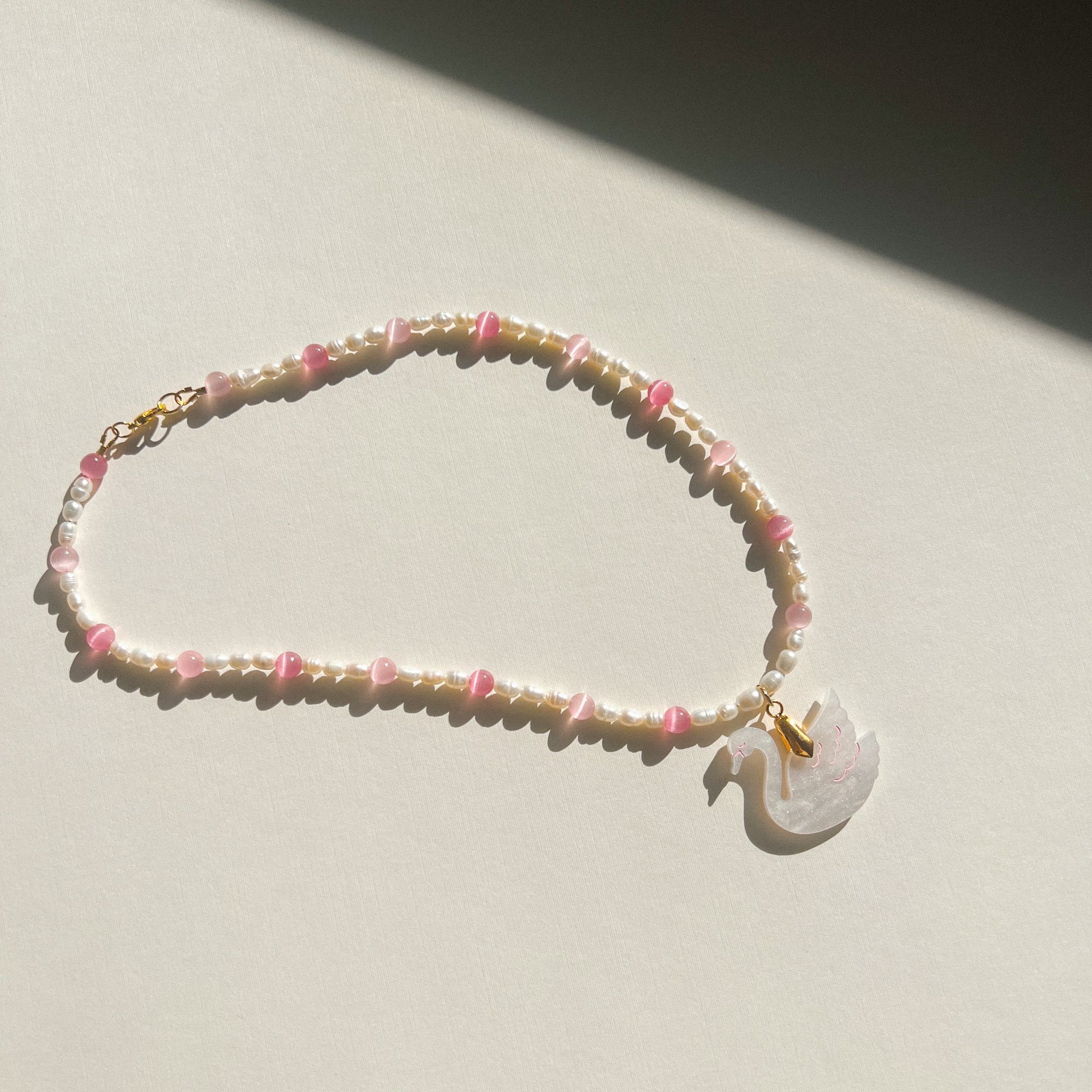 freshwater pearls, glass beads, and a pearlescent swan adorn this necklace. featuring gold-plated findings and approx. 16"
